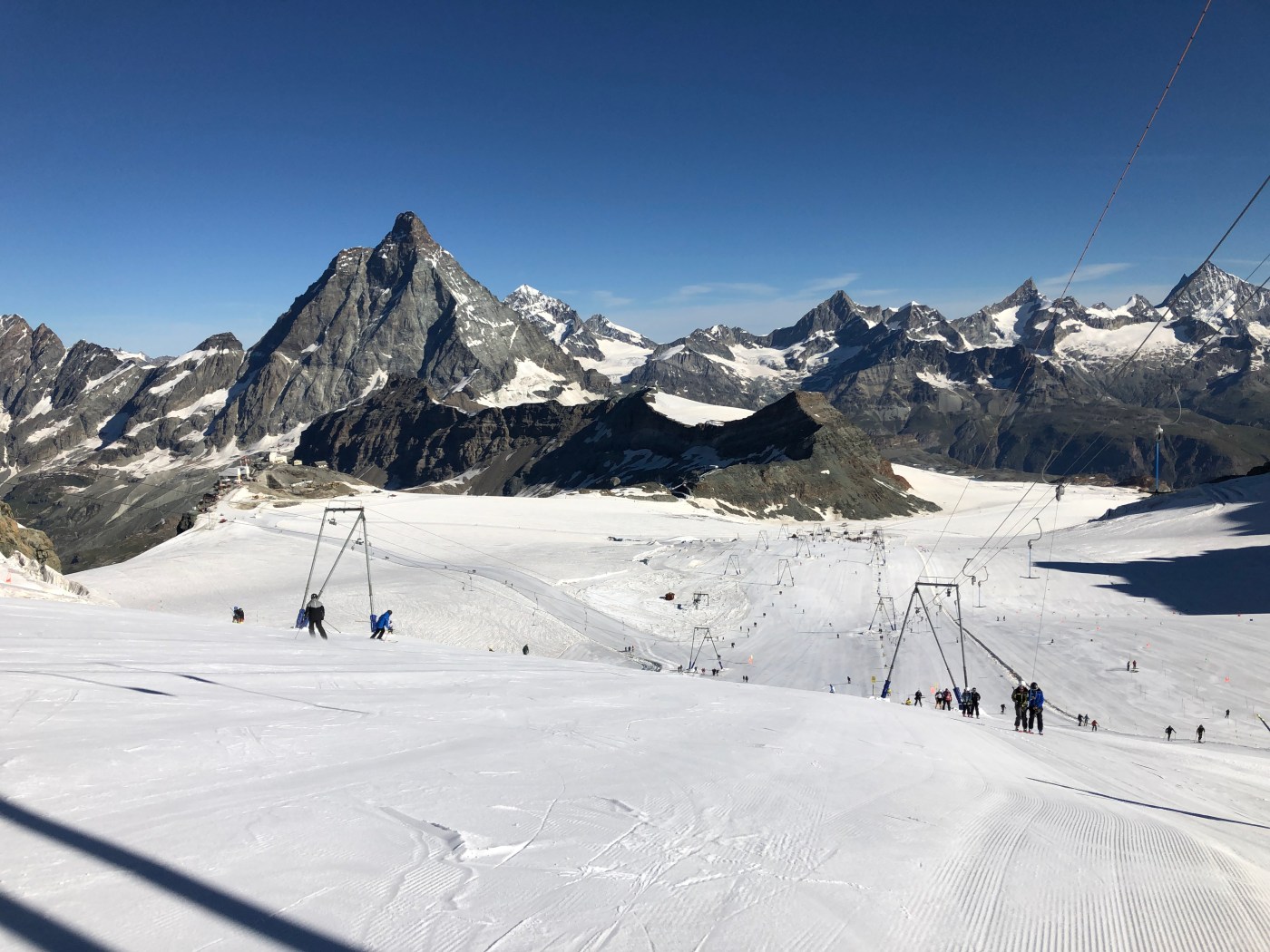 Unser erstes Schneecamp in Zermatt startete am Montag bereits vor Sonnenaufgang. Dafür wurden wir aber mit herrlichem Wetter auf dem Gletscher belohnt. Die Bedingungen zum Sommerskifahren waren top. Diese Umstände galten auch noch für den Dienstag. An den ersten zwei Tagen auf dem Gletscher widmeten wir uns der Grundtechnik auf den Slalomskis. Am Mittwoch blieb der Gletscher leider geschlossen, aufgrund der zu hohen Temperaturen während der Nacht. So konnte zumindest noch ein bisschen nachgeschlafen werden. Den restlichen Tag verbrachten wir mit Konditionstraining und Wakeboarden auf dem Schalisee in Täsch. Dies war definitiv anspruchsvoller als das Skifahren auf dem Gletscher. Am Donnerstag herrschten wieder perfekte Bedingungen auf dem Gletscher. Vom Donnerstag an wechselten wir auf die Riesenslalomskis. Zusätzlich sammelten wir bereits wieder erste Erfahrungen im Snow Park für diese Saison. Am Freitag fanden wir leider eine sehr gewittrige Wetterlage vor, woraufhin der Gletscher zum zweiten Mal geschlossen blieb in dieser Woche. So ging es etwas früher als gedacht wieder nach Hause.